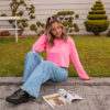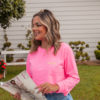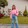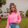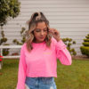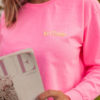 Blusa cropped em malha estonada 100% algodão, na cor rosa neon, com bordado lateral na cor amarelo neon, super leve e confortável, Modelagem ampla de shape solto, acabamento mangas em ribana canelada e barra no corte a fio.