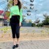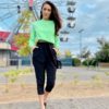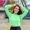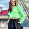 Blusa cropped em malha estonada 100% algodão, na cor verde neon, com bordado lateral na cor rosa neon, super leve e confortável, Modelagem ampla de shape solto, acabamento mangas em ribana canelada e barra no corte a fio.