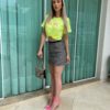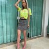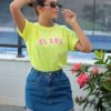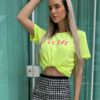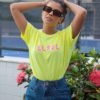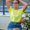 Blusa em malha estonada 100% algodão, na cor amarelo lemon neon, super leve e confortável, com estampa em silk frente na cor roxa.. A escrita diz ‘ O Sol’ .Modelagem ampla de shape solto, e acabamento mangas e barra no corte a fio.