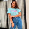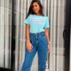 Blusa em malha estonada 100% algodão, na cor azul tiffany, super leve e confortável, com estampa em silk frente na cor pink. A escrita diz: ” O amor da minha vida sou eu mesma!” . Modelagem ampla de shape solto, com mangas dobradas e acabamento barra no corte a fio.
