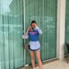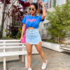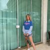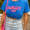 Blusa em malha estonada 100% algodão, na cor azul bic, super leve e confortável, com estampa em silk frente na cor rosa pink neon. A escrita diz ” Vibrações do pôr do sol “. Modelagem long de shape solto, e acabamento mangas e barra no corte a fio.