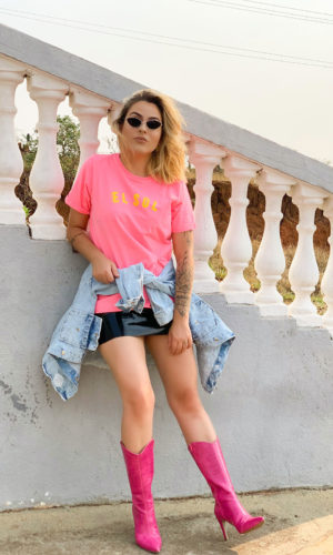 Blusa em malha estonada 100% algodão, na cor azul candy, super leve e confortável, com estampa em silk frente rosa neon. A escrita diz ‘ Seja sempre o melhor que você pode ser’ .Modelagem ampla de shape solto, e acabamento mangas dobradas e barra no corte a fio.
